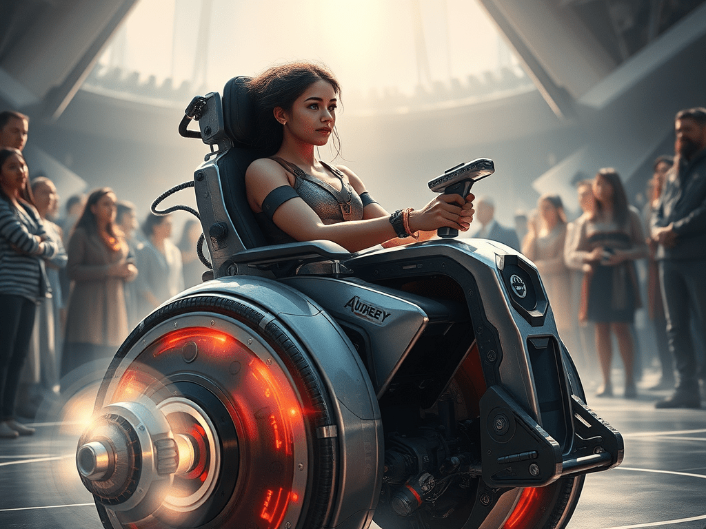 Once placed on the battle chair, Audrey activated it by pressing the top of her joystick. The flipper swung up in front of her.