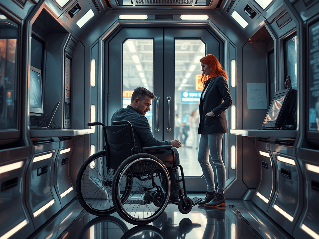 Derek pushes himself in his manual wheelchair out of his room through the automatic door. An electric wheelchair would require far less effort, but his physiotherapist has told him to use the manual one to maintain his muscle tone, especially in a low-gravity environment.