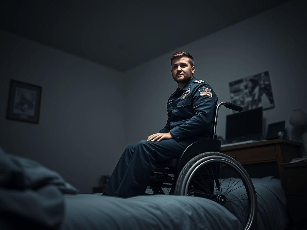 Derek hears the alarm going off on the electric wheelchair beside his bed.