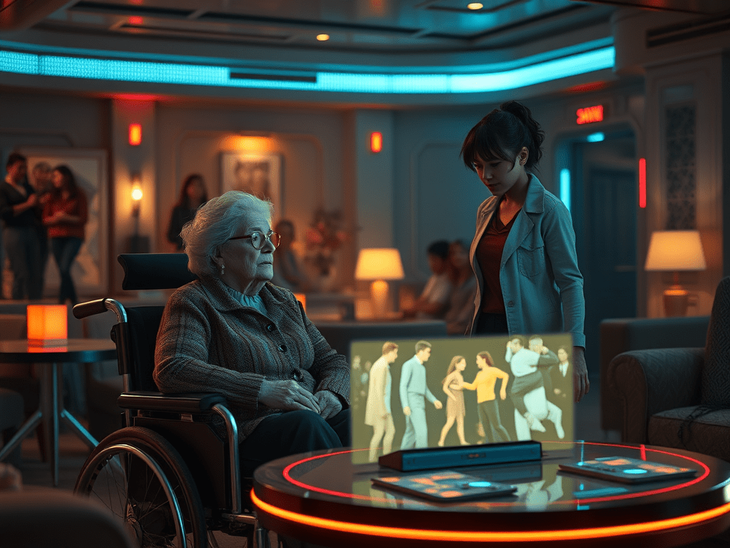 With the aged woman in the wheelchair, she pushed her to a table in the large entertainment room. A holographic film of young romance is playing on the table. It appears to be having an effect, with plenty of holding hands around them.